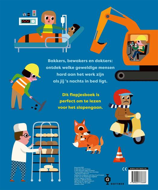 Het lijkt soms misschien alsof iedereen 's nachts lekker in zijn warme bedje ligt, maar dat is niet het geval! In dit kleurrijke boek staan een paar beroepen die diep in de nacht uitgevoerd worden, zodat het leven elke ochtend weer in alle drukte kan beginnen. Denk aan beroepen als visser en machinist, en ook de dokter en verpleger zijn al heel vroeg aan het werk. Zoals zo vaak opent Ingela P Arrhenius de ogen van de allerkleinsten voor nieuwe, spannende concepten met meer informatie over de wereld om hen heen.