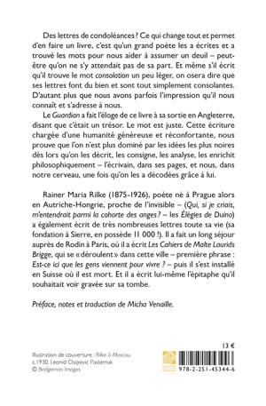 Des lettres de condoléances ? Ce qui change tout et permet d’en faire un livre, c’est qu’un grand poète les a écrites et a trouvé les mots pour nous aider à assumer un deuil – peut-être qu’on ne s’y attendait pas de sa part. Et même s’il écrit qu’il trouve le mot consolation un peu léger, on osera dire que ses lettres font du bien et sont tout simplement consolantes. D’autant plus que nous avons parfois l’impression qu’il nous connaît et s’adresse à nous.