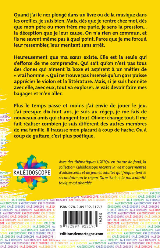 Quand j’ai le nez plongé dans un livre ou de la musique dans les oreilles, je suis bien. Mais, dès que je rentre chez moi, dès que mon père ou mon frère me parle, je sens la pression… la déception que je leur cause. On n’a rien en commun, et ils ne savent même pas à quel point. Parce que je me force à leur ressembler, leur mentant sans arrêt. Heureusement que ma sœur existe. Elle est la seule qui s’efforce de me comprendre. Qui sait qu’on n’est pas tous des clones qui aiment la boxe et aspirent à un métier de « vrai homme ». Qui ne trouve pas insensé qu’un gars puisse apprécier le violon et la littérature. Mais, si je suis honnête avec elle, avec eux, tout va exploser. Je vais devoir faire mes bagages et m’en aller. Plus le temps passe et moins j’ai envie de jouer le jeu. J’ai presque dix-huit ans, je suis au lycée, je me fais de nouveaux amis qui changent tout. Olivier change tout. Il me fait réaliser combien je suis différent des autres membres de ma famille. Il fracasse mon placard à coup de hache. Ou à coup de guitare, c’est plus poétique.