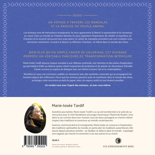 Un voyage à travers les mandalas et la sagesse du peuple animal. Les animaux sont de merveilleux enseignants. Ils nous apprennent la liberté, la spontanéité et la connexion au vivant. Dans un monde où l'intellect domine, ils nous rappellent l'importance de rétablir un équilibre, où l'intuition et le ressenti retrouvent leur juste place. Ce cahier de mandalas animaliers est une invitation à les rencontrer autrement : à travers le dessin, la réflexion, l'intuition... et même dans le monde des rêves. Bien plus qu'un simple cahier de coloriage, cet ouvrage propose un véritable parcours de transformation intérieure. Marie-Josee Tardif associe chaque mandala à une réflexion profonde, une intention et des pistes d'exploration qui permettent d'aller au-delà du geste créatif. Empreintes de tendresse et de poésie, les illustrations d'Amelie Clavier ouvrent un espace de dialogue avec soi-même à travers l'art et la contemplation. Reveillez en vous une connexion oubliée, en résonance avec des symboles universels qui accompagnent les humains depuis des millénaires. Parce que les animaux peuvent aussi se manifester dans le monde des rêves, prolongez cette rencontre au-delà du papier, dans cet espace subtil où tout devient possible. Un rendez-vous avec l'esprit des animaux... et avec vous-même.