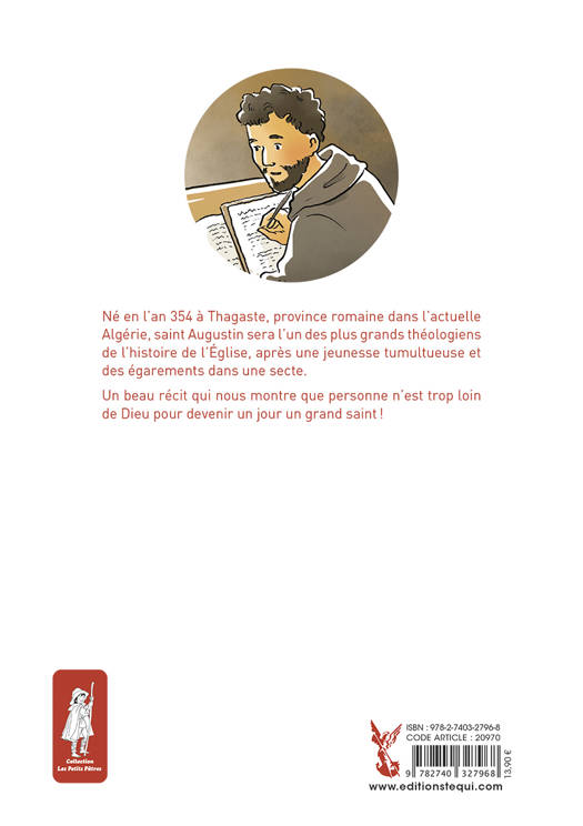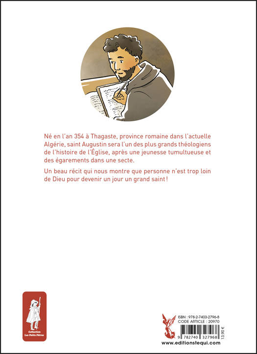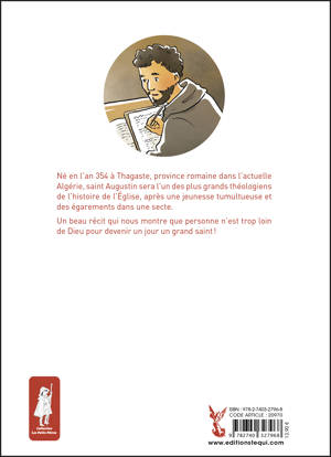 Saint Augustin est né en l'an 354 à Thagaste, province romaine dans l'actuelle Algérie. Passionné par la philosophie et la recherche de la vérité, après une jeunesse tumultueuse, il s'engage dans la secte des Manichéens, au grand désespoir de sa mère Monique, chrétienne, qui ne cesse de prier pour lui. Il part à Milan où sa rencontre décisive avec l'évêque saint Ambroise marquera le début de sa conversion. Celle-ci est effective en 386. Il est baptisé par saint Ambroise la nuit de Pâques 387. Après cinq ans en Europe, Augustin rentre en Afrique et fonde un monastère à Hippone, puis il est nommé évêque d'Hippone en 395. Il meurt le 28 août 430 à 75 ans en laissant une oeuvre immense qui nous parle encore aujourd'hui. Un beau récit qui nous montre que personne n'est trop loin de Dieu pour devenir un grand saint !