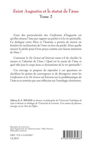 L'une des particularités des Confessions d'Augustin est qu'elles situent l'âme par rapport au péché et à la vie spirituelle. Ce dialogue entre Dieu et l'homme a permis de mettre en lumière les inclinations de l'âme en face du péché. Dans quelle mesure le péché peut-il être perçu comme une fausse imitation de Dieu ? Comment le De Genesi ad litteram tente-t-il de clarifier la nature et l'identité de l'âme ? Quel est le statut de l'âme et quel rôle joue le corps dans ce dynamisme de la vie spirituelle ? Cet ouvrage se propose de répondre à ces questions en clarifiant les points de convergence et de divergence entre les Confessions et le De Genesi ad litteram sur la problématique de l'âme et se termine par une réflexion sur l'ontologie chrétienne.