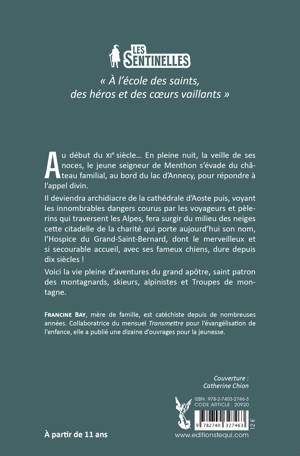 Au début du XIe siècle... En pleine nuit, la veille de ses noces, le jeune seigneur de Menthon s'évade du château familial, au bord du lac d'Annecy, pour répondre à l'appel divin. Il deviendra archidiacre de la cathédrale d'Aoste puis, voyant les innombrables dangers courus par les voyageurs et pèlerins qui traversent les Alpes, fera surgir du milieu des neiges cette citadelle de la charité qui porte aujourd'hui son nom, l'Hospice du Grand-Saint-Bernard, dont le merveilleux et si secourable accueil, avec ses fameux chiens, dure depuis dix siècles ! Voici la vie pleine d'aventures du grand apôtre, saint patron des montagnards, skieurs, alpinistes et Troupes de montagne.