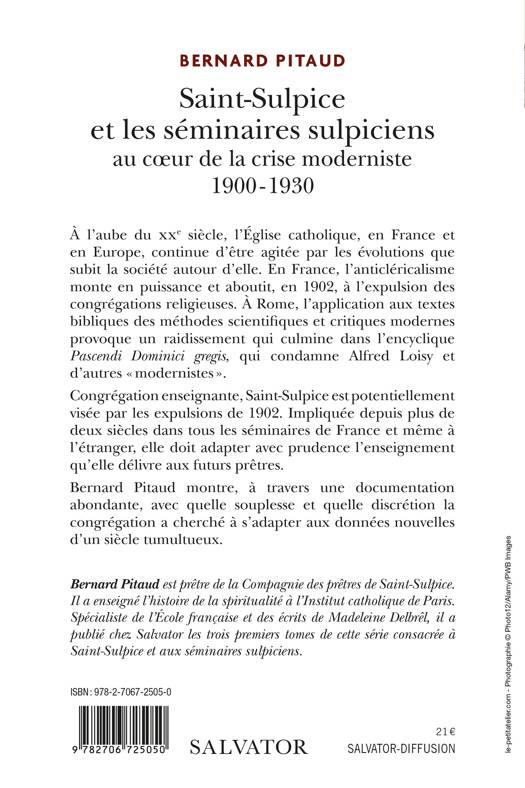 À l'aube du XXe siècle, l'Église catholique, en France et en Europe, continue d'être agitée par les évolutions que subit la société autour d'elle. En France, l'anticléricalisme monte en puissance et aboutit, en 1902, à l'expulsion des congrégations religieuses. À Rome, l'application aux textes bibliques des méthodes scientifiques et critiques modernes provoque un raidissement qui culmine dans l'encyclique Pascendi Dominici gregis, qui condamne Alfred Loisy et d'autres « modernistes ». Congrégation enseignante, Saint-Sulpice est potentiellement visée par les expulsions de 1902. Impliquée depuis plus de deux siècles dans tous les séminaires de France et même à l'étranger, elle doit adapter avec prudence l'enseignement qu'elle délivre aux futurs prêtres. Bernard Pitaud montre, à travers une documentation abondante, avec quelle souplesse et quelle discrétion la congrégation a cherché à s'adapter aux données nouvelles d'un siècle tumultueux. Bernard Pitaud est prêtre de la Compagnie des prêtres de Saint-Sulpice. Il a enseigné l'histoire de la spiritualité à l'Institut catholique de Paris. Spécialiste de l'École française et des écrits de Madeleine Delbrêl, il a publié chez Salvator les trois premiers tomes de cette série consacrée à Saint-Sulpice et aux séminaires sulpiciens.