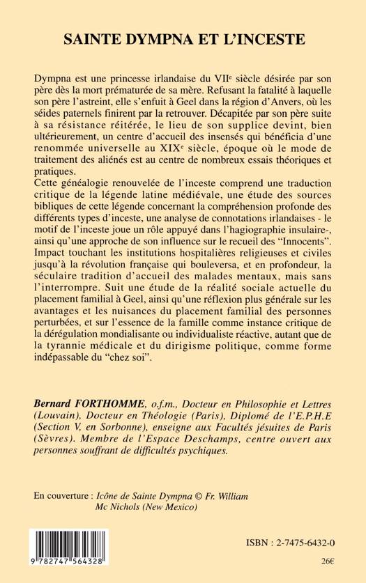 Dympna est une princesse irlandaise du VIIe siècle désirée par son père dès la mort prématurée de sa mère. Refusant la fatalité à laquelle son père l'astreint, elle s'enfuit à Geel dans la région d'Anvers, où les séides paternels finirent par la retrouver. Décapitée par son père suite à sa résistance réitérée, le lieu de son supplice devint, bien ultérieurement, un centre d'accueil des insensés qui bénéficia d'une renommée universelle au XIX e siècle, époque où le mode de traitement des aliénés est au centre de nombreux essais théoriques et pratiques.