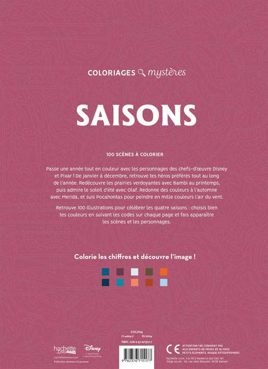 Passe une année tout en couleur avec les personnages des chefs-d’œuvre Disney et Pixar ! De janvier à décembre, retrouve tes héros préférés tout au long de l’année. Redécouvre les prairies verdoyantes avec Bambi au printemps, puis admire le soleil d’été avec Olaf. Ravive les couleurs de l’automne avec Merida, et suis Pocahontas pour peindre en mille couleurs l’air du vent.