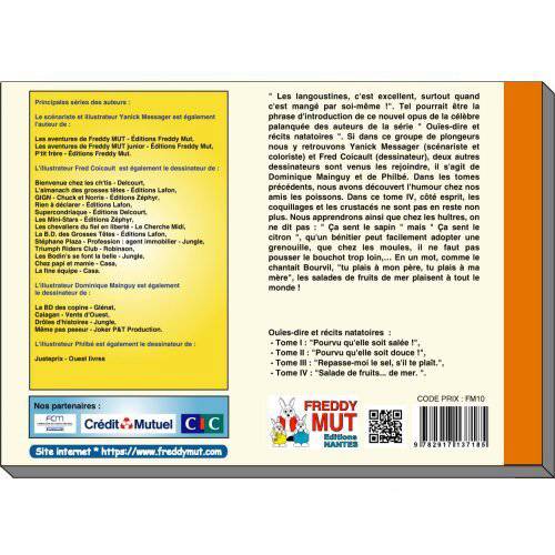 " Les langoustines, c'est excellent, surtout quand c'est mangé par soi-même !". Tel pourrait être la phrase d'introduction de ce nouvel opus de la célèbre palanquée des auteurs de la série " Ouïes-dire et récits natatoires ". Si dans ce groupe de plongeurs nous y retrouvons Yanick Messager (scénariste et coloriste) et Fred Coicault (dessinateur), deux autres dessinateurs sont venus les rejoindre, il s'agit de Dominique Mainguy et de Philbé. Dans les tomes précédents, nous avons découvert l'humour chez nos amis les poissons. Dans ce tome IV, côté esprit, les coquillages et les crustacés ne sont pas en reste non plus. Nous apprendrons ainsi que chez les huîtres, on ne dit pas : " Ça sent le sapin" mais " Ça sent le citron ", qu'un bénitier peut facilement adopter une grenouille, que chez les moules, il ne faut pas pousser le bouchot trop loin,… En un mot, comme le chantait Bourvil, "tu plais à mon père, tu plais à ma mère", les salades de fruits de mer plaisent à tout le monde !