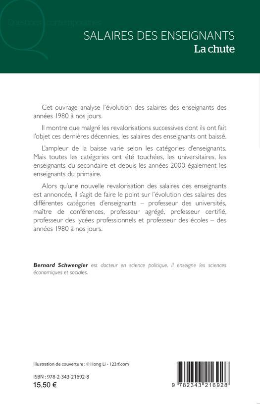Cet ouvrage analyse l’évolution des salaires des enseignants des années 1980 à nos jours. Il montre que malgré les revalorisations successives dont ils ont fait l’objet ces dernières décennies, les salaires des enseignants ont baissé. L’ampleur de la baisse varie selon les catégories d’enseignants. Mais toutes les catégories ont été touchées, les universitaires, les enseignants du secondaire et depuis les années 2000 également les enseignants du primaire. Alors qu’une nouvelle revalorisation des salaires des enseignants est annoncée, il s’agit de faire le point sur l’évolution des salaires des différentes catégories d’enseignants - professeur des universités, maître de conférences, professeur agrégé, professeur certifié, professeur des lycées professionnels et professeur des écoles - des années 1980 à nos jours.