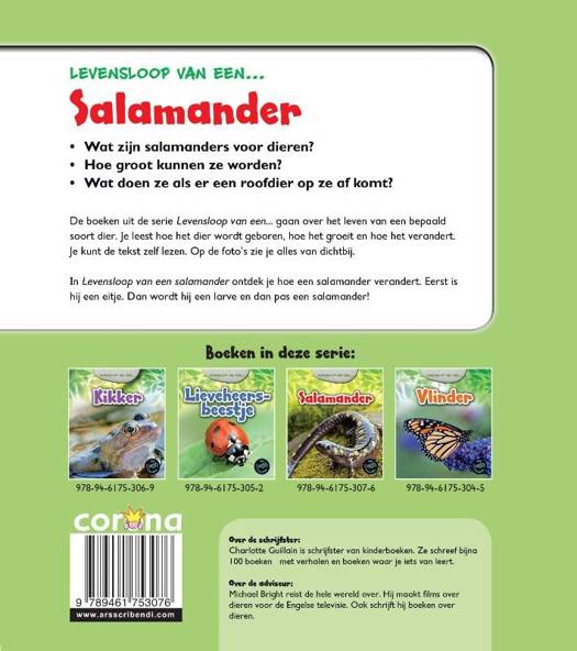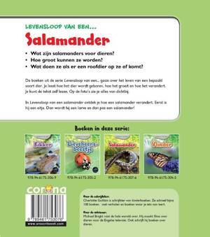 De boeken uit de serie levensloop van een ... gaan over het leven van een bepaald soort dier. Je leest hoe het dier wordt geboren, hoe het groeit en hoe het verandert. Je kunt de tekst zelf lezen. Op de foto’s zie je alles van dichtbij. - Wat zijn salamanders voor dieren? - Hoe groot kunnen ze worden? - Wat doen ze als er een roofdier op ze af komt? In levensloop van een salamander ontdek je hoe een salamander verandert. Eerst is hij een eitje. Dan wordt hij een larve en dan pas een salamander!