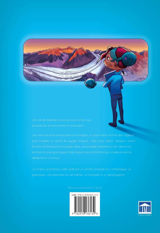 Une bande dessinée d'aventure pour s'initier aux sciences de l'environnement en s'amusant ! Une vielle sacoche perdue dans la montagne, un abominable hommes des neiges à leur trousse, un carnet de voyage intriguant .... Elea, Kalie, Aliénor, Margaux, Noam et Victor s’embarquent à nouveau dans une enquête haletante qui les mènera au sommet du plus grand glacier des Alpes et les confrontera aux conséquences du dérèglement climatique. Le contenu scientifique a été validé par un comité composé d’un climatologue, un glaciologue, une spécialiste du permafrost, un biologiste et un astrophysicien.