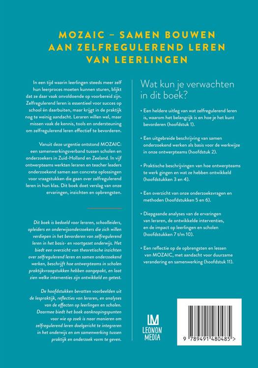 Vanuit deze urgentie ontstond MOZAIC: een samenwerkingsverband tussen scholen en onderzoekers in Zuid-Holland en Zeeland. In vijf ontwerpteams werkten leraren en teacher leaders onderzoekend samen aan concrete oplossingen voor vraagstukken die gaan over zelfregulerend leren in hun klas. Dit boek doet verslag van onze ervaringen, inzichten en opbrengsten.