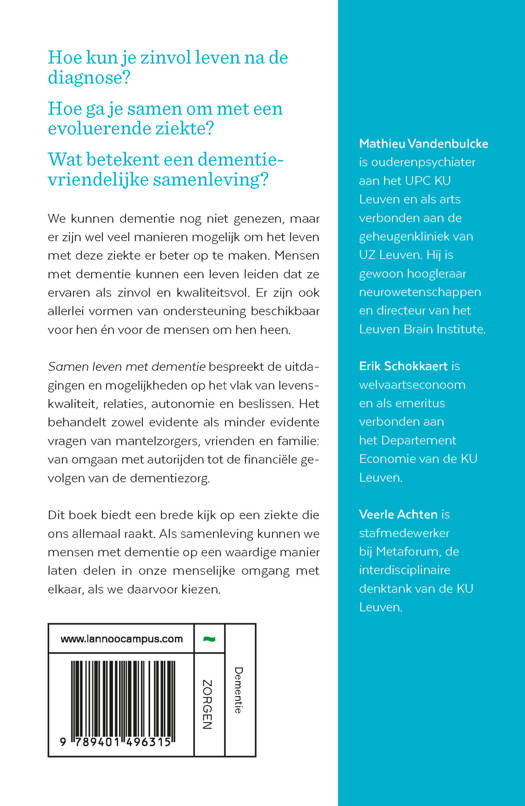 Hoe kun je zinvol leven na de diagnose? Hoe ga je samen om met een evoluerende ziekte? Wat betekent een dementievriendelijke samenleving? We kunnen dementie nog niet genezen, maar er zijn wel veel manieren mogelijk om het leven met deze ziekte er beter op te maken. Mensen met dementie kunnen een leven leiden dat ze ervaren als zinvol en kwaliteitsvol. Er zijn ook allerlei vormen van ondersteuning beschikbaar voor hen én voor de mensen om hen heen. Samen leven met dementie bespreekt de uitdagingen en mogelijkheden op het vlak van levenskwaliteit, relaties, autonomie en beslissen. Het behandelt zowel evidente als minder evidente vragen van mantelzorgers, vrienden en familie: van omgaan met autorijden tot de financiële gevolgen van de dementiezorg. Dit boek biedt een brede kijk op een ziekte die ons allemaal raakt. Als samenleving kunnen we mensen met dementie op een waardige manier laten delen in onze menselijke omgang met elkaar, als we daarvoor kiezen.