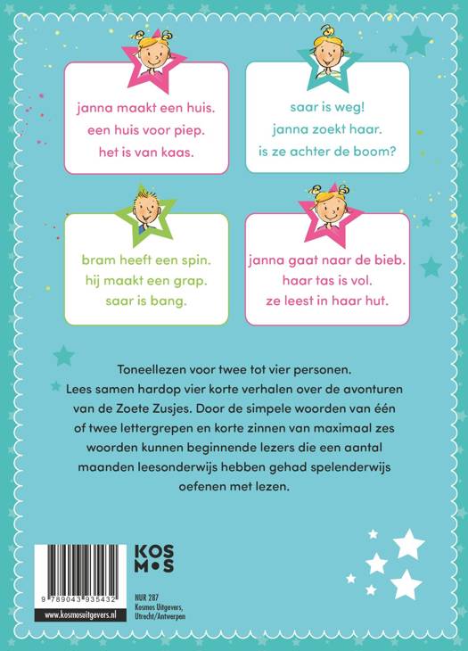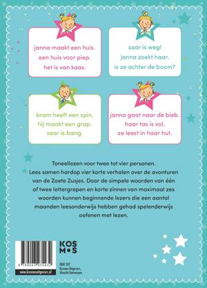 In ieder boek beleven de Zoete Zusjes Saar en Janna weer allerlei avonturen. En nu kunnen ook de jongste lezers daarvan meegenieten! Met in totaal maar liefst 144 bladzijden leesplezier zullen kinderen in groep 2 en 3 kunnen beginnen met het herkennen en lezen van de eerste letters, woordjes en zinnen. Eerst samen, en dan zelf! Natuurlijk zijn de verhalen weer opgevrolijkt met de leukste illustraties van Iris Boter.