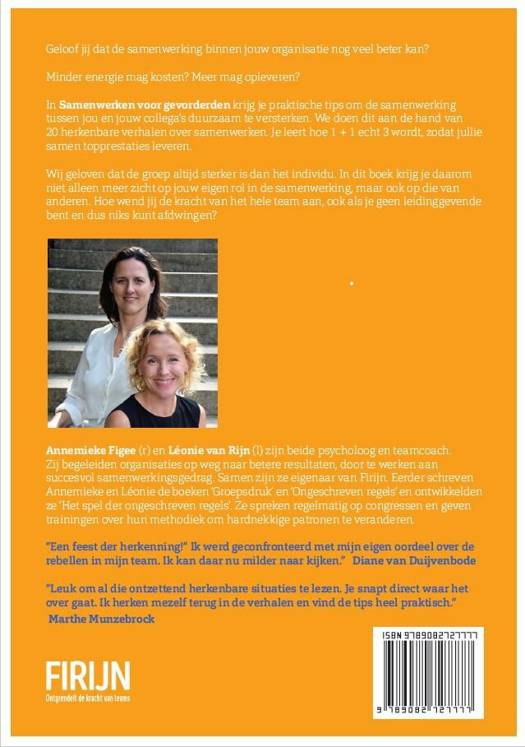Annemieke Figee (r) en Léonie van Rijn (l) zijn beide psycholoog en teamcoach. Zij begeleiden organisaties op weg naar betere resultaten, door te werken aan succesvol samenwerkingsgedrag. Samen zijn ze eigenaar van Firijn. Eerder schreven Annemieke en Léonie de boeken 'Groepsdruk' en 'Ongeschreven regels' en ontwikkelden ze 'Het spel der ongeschreven regels'. Ze spreken regelmatig op congressen en geven trainingen over hun methodiek om hardnekkige patronen te veranderen.