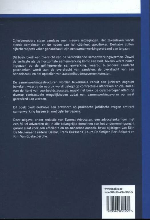 Cijferberoepers staan vandaag voor nieuwe uitdagingen. Het zakenleven wordt steeds complexer en de noden van het cliënteel specifieker. Derhalve zullen cijferberoepers vaker genoodzaakt zijn een samenwerkingsverband aan te gaan. Dit boek biedt een overzicht van de verschillende samenwerkingsvormen. Zowel de verticale als de horizontale samenwerking komt aan bod. Tevens wordt nader ingegaan op de geïntegreerde samenwerking, waarbij bijzondere aandacht geschonken wordt aan de overdracht van aandelen, de overdracht van een handelszaak en het opstellen van aandeelhoudersovereenkomsten. De samenwerkingsstructuren worden telkenmale vanuit een juridisch oogpunt bekeken, waarbij de nadruk wordt gelegd op contractuele afspraken en clausules. Aan de hand van voorbeeldclausules, maakt het boek de cijferberoeper attent op diverse contractuele mogelijkheden zodat een samenwerkingsvorm op maat gecreëerd kan worden. Dit boek biedt derhalve een antwoord op praktische juridische vragen omtrent samenwerking tussen én met cijferberoepers. Deze uitgave, onder redactie van Everest Advocaten, een advocatenkantoor met een 50-tal advocaten dat in alle belangrijke domeinen van het ondernemingsrecht garant staat voor een efficiënte en no-nonsense aanpak, bevat bijdragen van Stijn De Meulenaer, Frédéric Delbar, Frank Burssens, Laura De Smijter, Bert Bekaert en Kim Van Quekelberghe.