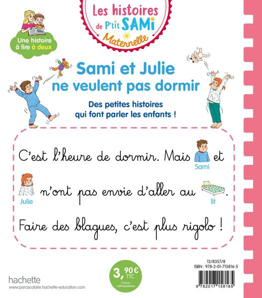C’est l’heure d’aller dormir pour Sami et Julie ! Mais ils ne l’entendent pas de cette oreille… Après un bon brossage de dents et la lecture de l’histoire du soir, Sami et Julie inventent des stratagèmes pour reculer le moment du coucher…