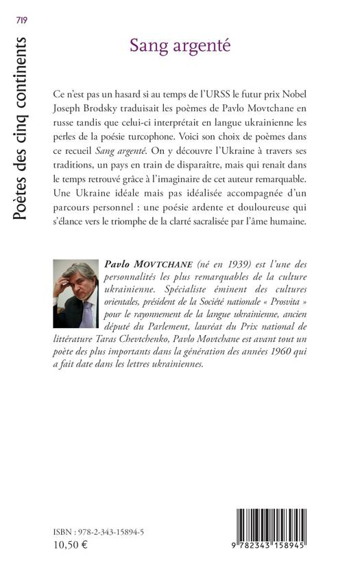 Ce n'est pas un hasard si au temps de l'URSS le futur prix Nobel Joseph Brodsky traduisait les poèmes de Pavlo Movtchane en russe tandis que celui-ci interprétait en langue ukrainienne les perles de la poésie turcophone. Voici son choix de poèmes dans ce recueil Sang argenté. On y découvre l'Ukraine à travers ses traditions, un pays en train de disparaître, mais qui renaît dans le temps retrouvé grâce à l'imaginaire de cet auteur remarquable. Une Ukraine idéale mais pas idéalisée, accompagnée d'un parcours personnel : une poésie ardente et douloureuse qui s'élance vers le triomphe de la clarté sacralisée par l'âme humaine.