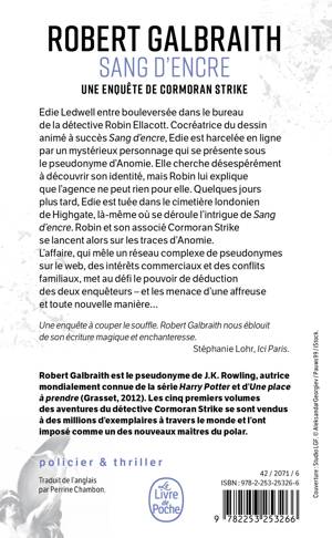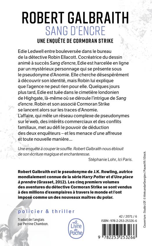 Edie Ledwell entre bouleversée dans le bureau de la détective Robin Ellacott. Cocréatrice du dessin animé à succès Sang d’encre, Edie est harcelée en ligne par un mystérieux personnage qui se présente sous le pseudonyme d’Anomie. Elle cherche désespérément à découvrir son identité, mais Robin lui explique que l’agence ne peut rien pour elle. Quelques jours plus tard, l’on apprend qu’Edie a été tuée dans le cimetière londonien de Highgate, là-même où se déroule l’intrigue de Sang d’encre. Robin et son associé Cormoran Strike se lancent alors sur les traces d’Anomie. L’affaire, qui mêle un réseau complexe de pseudonymes sur le web, des intérêts commerciaux et des conflits familiaux, met au défi le pouvoir de déduction des deux enquêteurs – et les menace d’une affreuse et toute nouvelle manière…