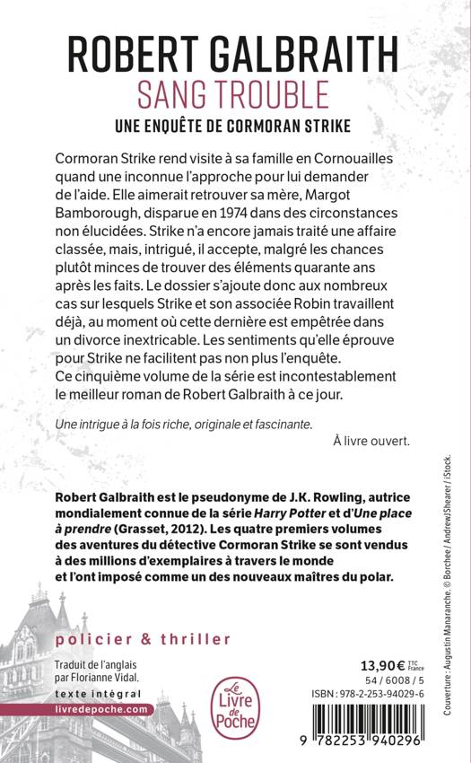 Robert Galbraith est le pseudonyme de J.K. Rowling, autrice mondialement connue de la série Harry Potter et d’Une place à prendre (Grasset, 2012). Les cinq premiers volumes des aventures du détective Cormoran Strike se sont vendus à des millions d’exemplaires à travers le monde et l’ont imposé comme un des nouveaux maîtres du polar.