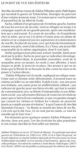 San'kia, deuxième roman de Zakhar Prilepine après Pathologies, qui racontait la guerre en Tchétchénie, témoigne du parcours d'une certaine jeunesse russe. Un roman qui se veut le pendant d'aujourd'hui de La Mère de Gorki. Sacha, militant d'un groupuscule d'extrême gauche, hantise de tous les services de sécurité, vient se réfugier un temps à la campagne auprès de ses grands-parents, après une manifestation qui a mal tourné. Il a cessé de travailler, vit d'expédients chez sa mère, qui se tue à la tâche à l'usine pour un salaire de misère et ne comprend pas les aspirations révolutionnaires de son fils. En plus de ses amis, avec qui il picole énormément, comme son père, mort d'alcoolisme, il y a Yana, une jeune fille responsable de la même organisation, dont il s'est épris. Arrêté quelques jours plus tard, torturé, humilié, laissé pour mort par la police, Sacha ne peut que se radicaliser davantage. Anna Politkovskaïa, la journaliste assassinée, avait de la sympathie pour ces jeunes, les seuls à oser affronter, à leurs risques et périls, le pouvoir en place. Des jeunes à qui on ne laisse que la liberté de se fracasser la tête contre les murs et de passer à l'action directe. "Zakhar Prilepine est à la mode, expliquait un critique russe. Crâne rasé et chemise noire déboutonnée, il pourrait jouer au cinéma un killer ou un anti-killer. Il plaît à tous : aux uns pour son réalisme, aux autres pour un antilibéralisme militant ; aux radicaux de gauche pour son héros révolté, qui hait la société de consommation avec sa liberté d'entreprendre et son délitement social ; aux adversaires libéraux de toutes les révolutions parce que ce héros-là est condamné, et que ces gamins enragés qui cassent les vitrines et brûlent les voitures ne pourront jamais accomplir aucune révolution." A quoi l'auteur de San'kia répondait d'avance : "La Russie se nourrit des âmes de ses fils, c'est cela qui la fait vivre. Ce ne sont pas les saints, ce sont les maudits qui la font vivre." Pas étonnant qu'en quelques années Zakhar Prilepine soit devenu, dans son pays, l'un des écrivains les plus populaires et son roman San'kia un best-seller sur internet.