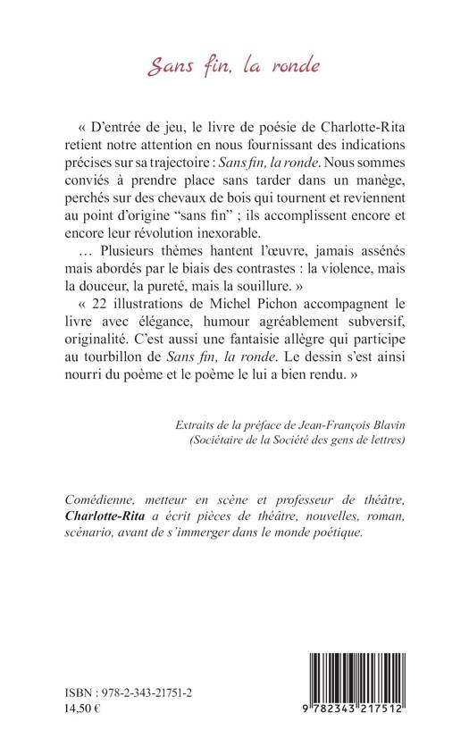 « D'entrée de jeu, le livre de poésie de Charlotte-Rita retient notre attention en nous fournissant des indications précises sur sa trajectoire : Sans fin, la ronde. Nous sommes conviés à prendre place sans tarder dans un manège, perchés sur des chevaux de bois qui tournent et reviennent au point d'origine "sans fin" ; ils accomplissent encore et encore leur révolution inexorable. Plusieurs thèmes hantent l'oeuvre, jamais assénés mais abordés par le biais des contrastes : la violence, mais la douceur, la pureté, mais la souillure. » « 22 illustrations de Michel Pichon accompagnent le livre avec élégance, humour agréablement subversif, originalité. C'est aussi une fantaisie allègre qui participe au tourbillon de Sans fin, la ronde. Le dessin s'est ainsi nourri du poème et le poème le lui a bien rendu. »