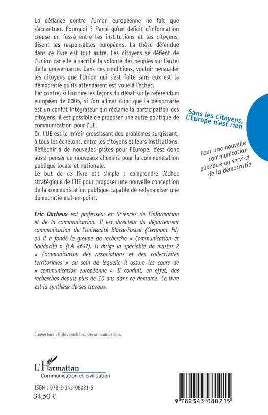 D'après les responsables européens la défiance de l'Union européenne tient à un déficit d'information entre les institutions et les citoyens. La thèse défendue dans ce livre est que les citoyens se défient de l'Union car elle a sacrifié la volonté des peuples sur l'autel de la gouvernance. Vouloir persuader les citoyens que l'Union qui s'est faite sans eux est la démocratie qu'ils attendaient est voué à l'échec. Le but de ce livre est de comprendre cet échec pour proposer une nouvelle conception de la communication publique capable de redynamiser une démocratie mal-en-point.