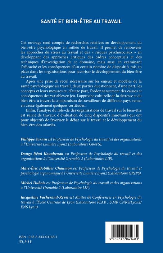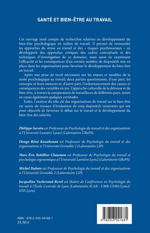 Cet ouvrage rend compte de recherches relatives au développement du bien-être psychologique en milieu de travail. Il permet de renouveler les approches du stress au travail et des "risques psychosociaux" en développant des approches critiques des cadres conceptuels et des techniques d'investigation de ce domaine, mais aussi en examinant l'efficacité et les conséquences d'un certain nombre de dispositifs mis en place dans les organisations pour favoriser le développement du bien-être au travail.
