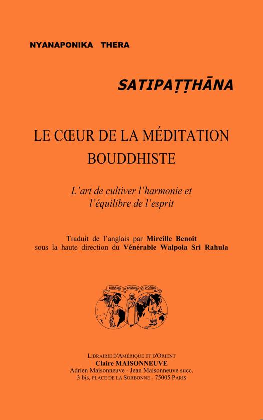 NYANAPONIKA THERA Satipatthana. Le coeur de la méditation bouddhiste. L'art de cultiver l'harmonie et l'équilibre de l'esprit.. Traduit de l'anglais par Mireille Benoit, sous la haute direction du Vénérable Walpola Sri Rahula.