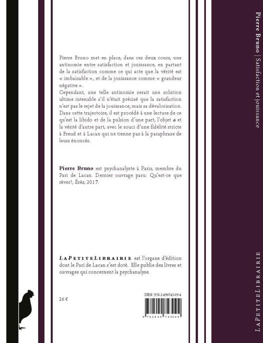Pierre Bruno met en place, dans ces deux cours, une antinomie entre satisfaction et jouissance, en partant de la satisfaction comme ce qui acte que la vérité est « imbaisable », et de la jouissance comme «grandeur négative ».<br /> Cependant, une telle antinomie serait une solution ultime intenable s’il n’était précisé que la satisfaction n’est pas le rejet de la jouissance, mais sa dévalorisation. Dans cette trajectoire, il est procédé à une lecture de ce qu’est la libido et de la pulsion d’une part, l’objet a et la vérité d’autre part, avec le souci d’une fidélité stricte à Freud et à Lacan qui ne tienne pas à la paraphrase de leurs énoncés.<br />