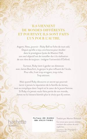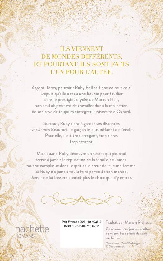 Ils viennent de mondes différents. Et pourtant, ils sont faits l'un pour l'autre. Argent, fêtes, pouvoir : Ruby Bell se fiche de tout cela. Depuis qu'elle a reçu une bourse pour étudier dans le prestigieux lycée de Maxton Hall, son seul objectif est de travailler dur à la réalisation de son rêve de toujours : intégrer l’université d’Oxford. Surtout, Ruby tient à garder ses distances avec James Beaufort, le garçon le plus influent de l’école. Pour elle, il est trop arrogant, trop riche. Trop attirant. Mais quand Ruby découvre un secret qui pourrait ternir à jamais la réputation de la famille de James, tout se complique dans l’esprit et le cœur de la jeune femme. Si Ruby n’a jamais voulu faire partie de son monde, James ne lui laissera bientôt plus le choix que d’y entrer.