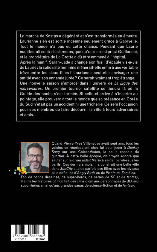 La marche de Kostas a dégénéré et s’est transformée en émeute. Laurianne s’en est sortie indemne seulement grâce à Gabryelle. Tout le monde n’a pas eu cette chance. Pendant que Laurie manifestait contre les brostas, quelqu’un s’en est pris à Guillaume, et le propriétaire de La Grotte a dû être emmené à l’hôpital. Après la manif, Sarah-Jade a changé son fusil d’épaule vis-à-vis de Laurie : la solidarité féminine mènerait-elle enfin à une véritable trêve entre les deux filles ? Laurianne peut-elle envisager une amitié avec son ennemie jurée ? Ce serait vraiment trop zarbi. Une nouvelle saison s’amorce dans l’univers de La Ligue des mercenaires. Un premier tournoi satellite se tiendra là où la Guilde des noobs s’est formée. Si celle-ci arrive à donner une bonne performance, elle prouvera à tout le monde que sa présence en Corée du Sud n’était pas un accident ni une tricherie. Ce sera l’occasion pour ses membres de faire découvrir la ville à leurs adversaires et amis…