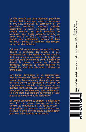 Guy Burgel développe ici un argumentaire avec la volonté de rétablir des faits, de faire tomber les fausses bonnes idées, de défendre un mode de vie qui représente l’essentiel de la population mondiale, et d’en valoriser les qualités intrinsèques. Les villes, en particulier françaises et européennes, sont millénaires. Ne sont-elles pas toujours parvenues à faire preuve de créativité et de résilience ?