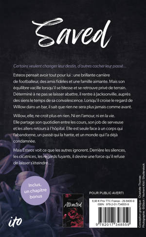 Certains veulent changer leur destin, d'autres cacher leur passé... Esteos pensait avoir tout pour lui : une brillante carrière de footballeur, des amis fidèles et une famille aimante. Mais son équilibre vacille lorsqu’il se blesse et se retrouve privé de terrain. Déterminé à ne pas se laisser abattre, il rentre à Jacksonville, auprès des siens le temps de sa convalescence. Lorsqu’il croise le regard de Willow dans un bar, il sait que rien ne sera plus jamais comme avant. Willow, elle, ne croit plus en rien. Ni en l’amour, ni en la vie. Elle partage son quotidien entre les cours, son job de serveuse et les allers-retours à l’hôpital. Elle est seule face à un corps qui l’abandonne, un passé qui la hante, et un monde qui l’a déjà condamnée. Mais Esteos voit ce que les autres ignorent. Derrière les silences, les cicatrices, les regards fuyants, il devine une force qu’il refuse de laisser s’éteindre…