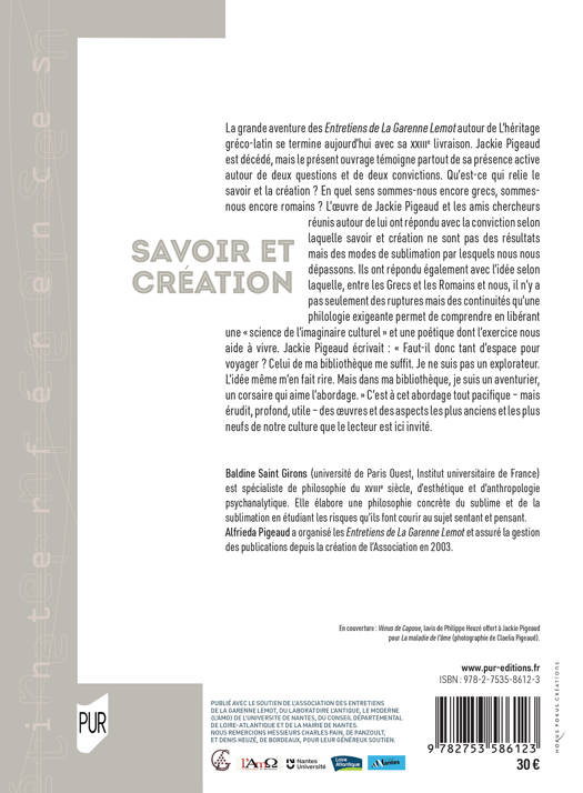 La grande aventure des Entretiens de La Garenne Lemot autour de L'héritage gréco-latin se termine aujourd'hui avec sa XXIIIe livraison. Jackie Pigeaud est décédé, mais le présent ouvrage témoigne partout de sa présence active autour de deux questions et de deux convictions. Qu'est-ce qui relie le savoir et la création ? En quel sens sommes-nous encore grecs, sommes-nous encore romains ? L'oeuvre de Jackie Pigeaud et les amis chercheurs réunis autour de lui ont répondu avec la conviction selon laquelle savoir et création ne sont pas des résultats mais des modes de sublimation par lesquels nous nous dépassons. Ils ont répondu également avec l'idée selon laquelle, entre les Grecs et les Romains et nous, il n'y a pas seulement des ruptures mais des continuités qu'une philologie exigeante permet de comprendre en libérant une « science de l'imaginaire culturel » et une poétique dont l'exercice nous aide à vivre. Jackie Pigeaud écrivait : « Faut-il donc tant d'espace pour voyager ? Celui de ma bibliothèque me suffit. Je ne suis pas un explorateur. L'idée même m'en fait rire. Mais dans ma bibliothèque, je suis un aventurier, un corsaire qui aime l'abordage. » C'est à cet abordage tout pacifique - mais érudit, profond, utile - des oeuvres et des aspects les plus anciens et les plus neufs de notre culture que le lecteur est ici invité.