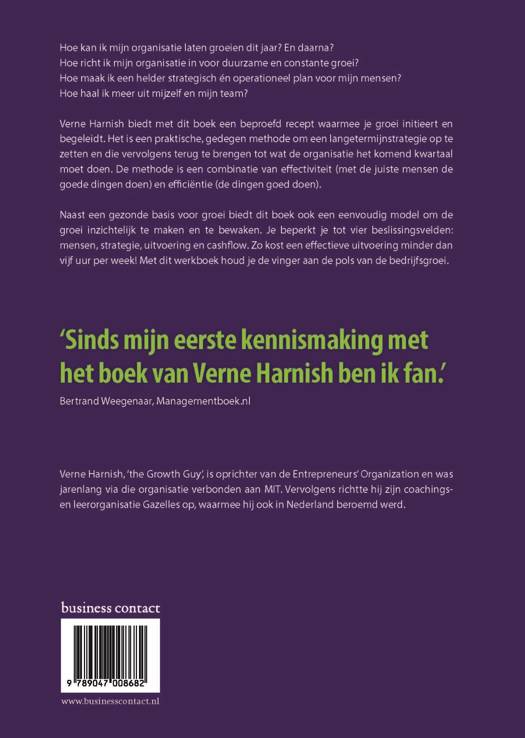 Verne Harnish biedt met 'Scaling up' een beproefd recept waarmee je groei initieert en begeleidt. Hij beantwoordt hierin vragen als: hoe kan ik mijn organisatie laten groeien dit jaar? En daarna? Hoe richt ik mijn organisatie in voor duurzame en constante groei? Hoe maak ik een helder strategisch én operationeel plan voor mijn mensen? Hoe haal ik meer uit mijzelf en mijn team? 'Scaling up' is een praktische, gedegen methode om een langetermijnstrategie op te zetten en die vervolgens terug te brengen tot wat de organisatie het komend kwartaal moet doen. De methode is een combinatie van effectiviteit (met de juiste mensen de goede dingen doen) en efficiëntie (de dingen goed doen). Naast een gezonde basis voor groei biedt dit boek ook een eenvoudig model om de groei inzichtelijk te maken en te bewaken. Je beperkt je tot vier beslissingsvelden: mensen, strategie, uitvoering en cashflow. Zo kost een effectieve uitvoering minder dan vijf uur per week! Met dit werkboek houd je de vinger aan de pols van de bedrijfsgroei.