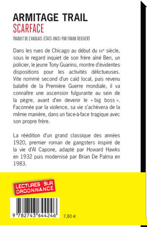 Après l'avoir perfectionné dans toutes les branches du bel art du meurtre, le gouvernement relâchait Tony Guarino. Tony rentrait avec un nouveau visage et un tas d'idées qui s'exerceraient inévitablement lors de leur mise en pratique. Cette atroce nuit de bataille dans les bois qui lui avait rapporté ses médailles lui avait laissé aussi une longue cicatrice livide sur le côté gauche du visage. Les muscles et nerfs qui entouraient sa bouche avaient dû être impliqués dans l'affaire et, à présent, le coin gauche de ses lèvres tirait en permanence vers le bas. Quand il souriait, ce coin-là refusait de sourire et conférait à son visage un aspect étonnamment sinistre. Désormais on le surnommerait Scarface. Écrit à la fin des années vingt, «Scarface» est un grand roman noir précurseur de l'âge d'