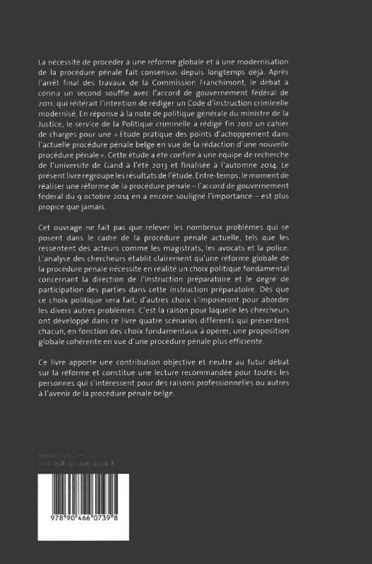 Ce livre apporte une contribution objective et neutre au futur débat sur la réforme et constitue une lecture recommandée pour toutes les personnes qui s'intéressent pour des raisons professionnelles ou autres à l'avenir de la procédure pénale belge.