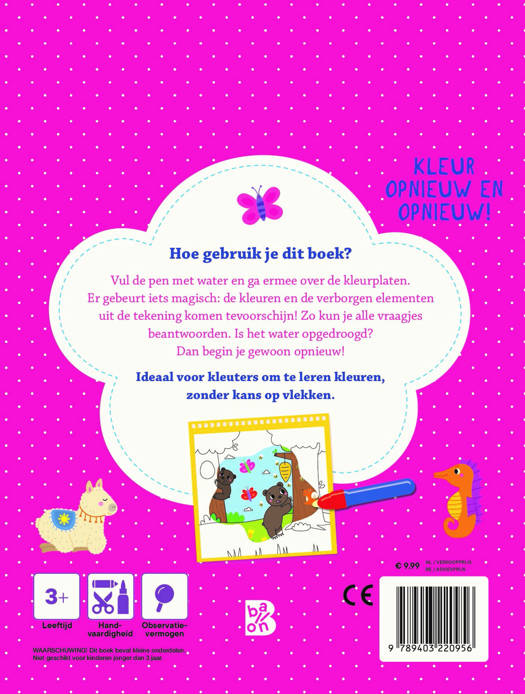 Met dit boek vol schattige dieren is er echte magie in het spel! Vul de bijhorende pen met water en kleur ermee op de pagina's. Alle kleuren komen tevoorschijn. Nadat alles weer is opgedroogd, verdwijnen de kleuren weer zodat je elke keer opnieuw kunt beginnen. Bij elke tekening staan ook enkele zoekvraagjes die je pas kunt oplossen wanneer je alle details tevoorschijn hebt getoverd. Ideaal voor kleuters om te leren kleuren, zonder kans op vlekken.
