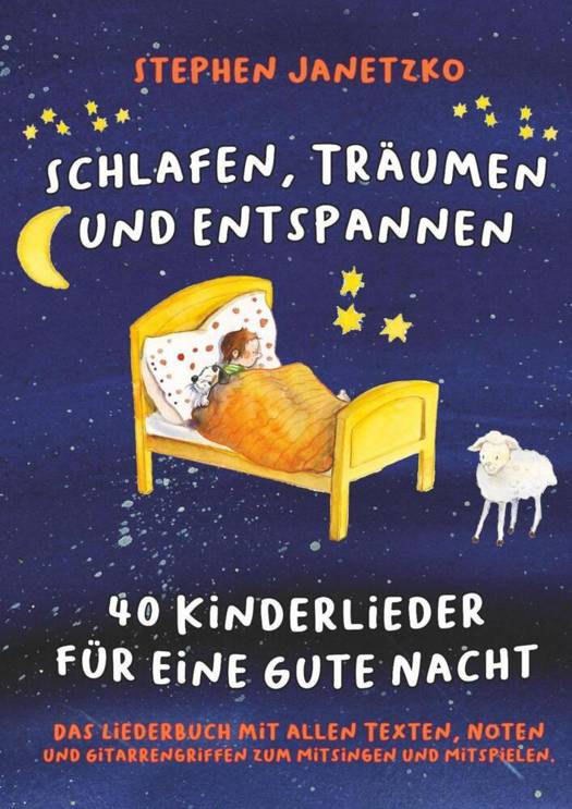Schlafen, Träumen und Entspannen - 40 Kinderlieder für eine gute Nacht. Das Liederbuch mit allen Texten, Noten und Gitarrengriffen zum Mitsingen und Mitspielen.Kinderlieder für süße Träume, zum Einschlafen und zur Ruhe kommen.Alle Lieder im Liederbuch:1. Wenn der Bär mich in den Arm nimmt2. Engelchen, Engelchen (Schutzengel-Lied)3. Weißt du, wie viel Sternlein stehen?4. Alle braven Kinder schlafen (Schlaflied)5. Schlafen ist schön6. Mein lieber Sandmann7. Augen Ohren Nase8. Ganz gelassen9. Alle gehen jetzt zur Ruh (Abendlied)10. Gute Nacht, mein kleiner Engel11. Joe der Astronaut12. Der Vollmond13. Ich bin müde14. Ich breite meine Flügel aus15. Gute Nacht (Ab mit dir ins Bett)16. Geht der Tag zu Ende17. Heute ist so viel geschehen18. Das Turnen ist zu Ende19. Gähnmadame und Schnarchmonsieur20. Wenn ich müde bin21. Schlaf, mein Kindlein, schlafe ein22. Nimm deine Träume23. Komm, mein kleines Kätzchen24. Du, mein allerliebstes Kuscheltier (Das Kuscheltierlied)25. Gute Nacht, ihr lieben Leute26. Ich trag dich27. Schlaf, mein Töchterlein28. Gute Nacht, mein Engel29. Gute Nacht, lieber Himmel30. Ich liege auf der Wiese31. Gute Nacht-Lied (Der Tag hat sich geneiget)32. Nun sagen wir euch allen (Gute Nacht)33. Husch, husch, ins Bettchen34. Ich schenk dir einen Stern (Sternenkinder-Lied)35. Sieh, wie die Sterne leuchten36. Mein Traumboy Felix Silberhaar37. Leise, leise, leise38. Schlaf, mein Kind, schlaf leise (Wiegenlied)39. Mein bester Freund, mein Engel40. Stille ist es bei den Schafen -Viel Freude beim Singen!