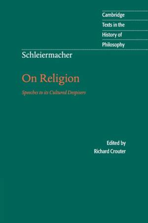 Schleiermacher's On Religion: Speeches to its Cultured Despisers is a classic of modern Protestant religious thought that powerfully displays the tensions between the Romantic and Enlightenment accounts of religion. This edition presents the original 1799 text in English for the first time. Richard Crouter's introduction places the work in the milieu of early German Romanticism, Kant criticism, the revival of Spinoza and Plato studies, and theories of literary criticism and of the physical sciences. This fully annotated edition also contains a chronology and notes on further reading.