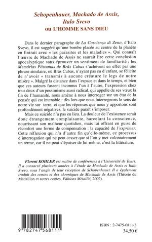 Dans le dernier paragraphe de La Coscienza di Zeno d'Italo Svevo, il est suggéré qu'une bombe placée au centre de la planète en finirait avec « les parasites et les maladies ». Qui connaît l'uvre de Machado de Assis ne saurait lire cette conclusion apocalyptique sans éprouver un sentiment de familiarité. Malgré la distance dans l'espace et dans le temps, et bien que ces auteurs fussent inconnus l'un à l'autre, l'expression chez tous deux d'un pessimisme aussi radical, nous amène à nous interroger sur un état de la pensée qui est intenable.