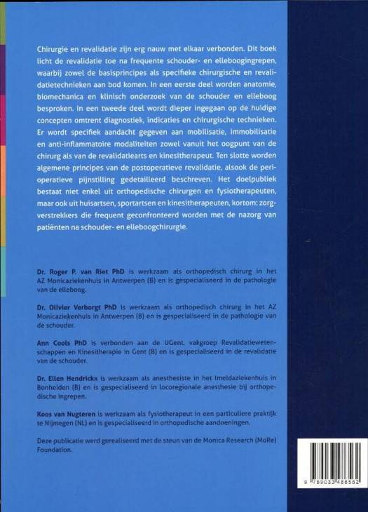 Chirurgie en revalidatie zijn erg nauw met elkaar verbonden. Dit boek licht de revalidatie na frequente schouder- en elleboogingrepen toe, waarbij zowel de basisprincipes als specifieke chirurgische en revalidatietechnieken aan bod komen.