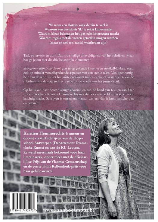 Een van de grootste levende auteurs van de Lage Landen Waarom een slotzin vaak de zin te veel is Waarom een overdosis 'ik' je tekst kapotmaakt Waarom kleur bekennen het pas echt interessant maakt Waarom regels met de voeten getreden mogen worden (maar er wel een aantal waarheden zijn) Taal, observatie en durf. Dat is de heilige drievuldigheid van het schrijven. Maar hoe ga je om met die drie belangrijke elementen? Schrijven - Kun je dat leren? gaat in op gekende kwesties en struikelblokken, maar ook op minder vanzelfsprekende aspecten van een sterke tekst. Van openhartigheid van de schrijver tot het juiste evenwicht tussen expliciet en impliciet, van de subtiliteit van de vrije indirecte rede tot de kracht van het juiste detail. Op basis van haar decennialange ervaring en aan de hand van teksten van haar studenten schept Kristien Hemmerechts met dit boek een beeld van wat een tekst krachtig maakt. Schrijven is een talent - maar wel een dat je kunt aanscherpen en oefenen.