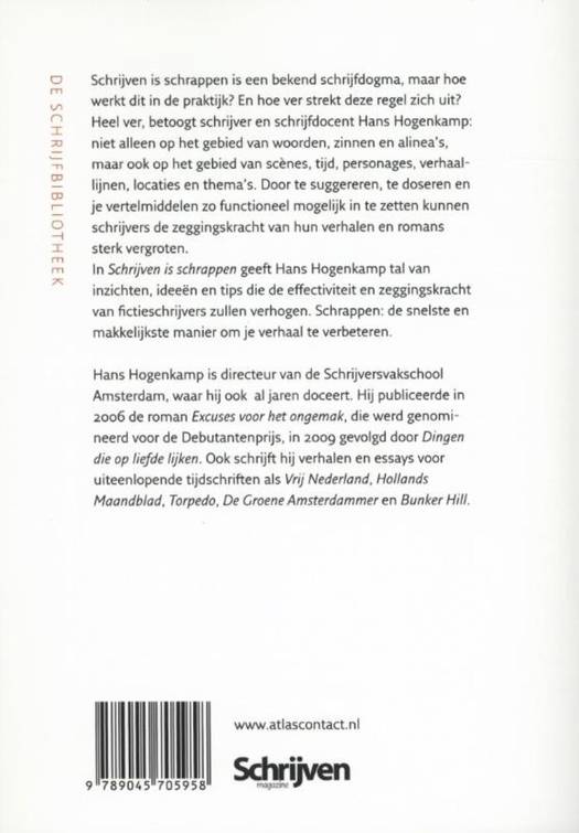 Schrijven is schrappen is een bekend schrijfdogma, maar hoe werkt dit in de praktijk? En hoe ver strekt deze regel zich uit? Heel ver, betoogt schrijver en schrijfdocent Hans Hogenkamp: niet alleen op het gebied van woorden, zinnen en alinea's, maar ook op het gebied van scènes, tijd, personages, verhaallijnen, locaties en thema's. Door te suggereren, te doseren en je vertelmiddelen zo functioneel mogelijk in te zetten, kunnen schrijvers de zeggingskracht van hun verhalen en romans sterk vergroten. In Schrijven is schrappen geeft Hans Hogenkamp tal van inzichten, ideeën en tips die de effectiviteit en zeggingskracht van fictieschrijvers zullen verhogen. Schrappen: de snelste en makkelijkste manier om je verhaal te verbeteren.