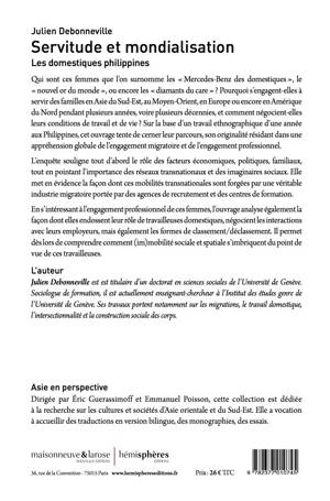 Qui sont ces femmes que l’on surnomme les « Mercedes-Benz des domestiques », le « nouvel or du monde », ou encore les « diamants du care »Â ? Pourquoi s’engagent-elles à servir des familles en Asie du Sud-Est, au Moyen-Orient, en Europe ou encore en Amérique du Nord pendant plusieurs années, voire plusieurs décennies ? Sur la base d’un travail ethnographique d’une année aux Philippines, cet ouvrage tente de cerner leur parcours. L’enquête souligne le rôle des facteurs économiques, politiques, familiaux, tout en pointant l’importance des réseaux transnationaux et des imaginaires sociaux, et met en évidence l’existence d’une véritable industrie migratoire. Elle analyse la façon dont ces femmes endossent leur rôle de travailleuses domestiques, négocient les interactions avec leurs employeurs, mais également les formes de classement/déclassement, permettant dès lors de comprendre comment (im)mobilité sociale et spatiale s’imbriquent, du point de vue de ces travailleuses.