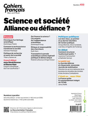 La science occupe une place centrale dans nos sociétés contemporaines. Elle est à la fois source de progrès techniques, de croissance économique et d’améliorations concrètes de la vie quotidienne, elle soulève également un certain nombre de questionnements, de controverses et devient à certaines occasions, un objet de défiance. Du développement de la médecine à l’essor de l’intelligence artificielle, des politiques de recherche publiques aux débats sur le climat, la science ne se déploie jamais hors du champ social : elle est inséparable des enjeux politiques, économiques, culturels et éthiques de son temps. Ce numéro de Cahiers français se propose d’explorer les multiples facettes de ce lien entre science et société à travers diverses thématiques croisant les approches politiques, historiques, sociologiques, économiques et éthiques.