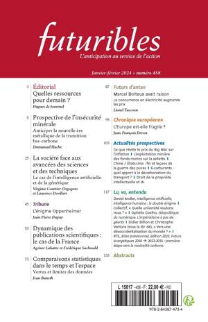 Actualités prospectives Paglia Morgan. Ce que révèle le prix du Big Mac sur l’inflation Papon Pierre. L’exploitation minière des fonds marins sur la sellette Valensi Édouard. Chine / États-Unis : fin et leçons de la guerre des puces Lamblin Véronique. E-carburants : quel apport à la décarbonation du transport ? Fauchoux Vincent. Droit de la propriété intellectuelle et IA