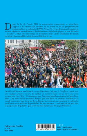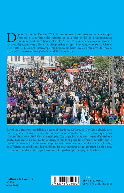 Depuis la fin de l'année 2019, la communauté universitaire et scientifique s'oppose à la réforme des retraites et au projet de loi de programmation pluriannuelle de la recherche (LPPR). Ainsi, 155 revues de sciences humaines et sociales, dépassant leurs différences disciplinaires ou épistémologiques, se sont déclarées "en lutte". Elles ont interrompu ou bouleversé leurs cycles ordinaires de travail, participé à des assemblées générales et défilé dans la rue. Cultures & Conflits a choisi, avec une vingtaine d'autres revues, de publier un numéro blanc.