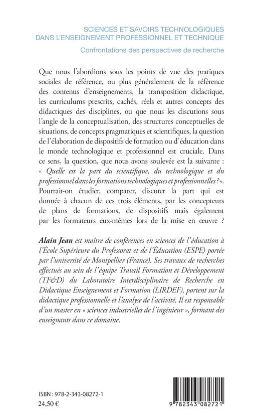 La question de l'élaboration de dispositifs de formation ou d'éducation dans le monde technologique et professionnel est cruciale. Dans ce sens, la question, que soulève les auteurs de cet ouvrage est la suivante : « Quelle est la part du scientifique, du technologique et du professionnel dans les formations technologiques et professionnelles ? ». Pourrait-on étudier, comparer, discuter la part qui est donnée à chacun de ces trois éléments, par les concepteurs de plans de formations, de dispositifs mais également par les formateurs eux-mêmes lors de la mise en oeuvre ?