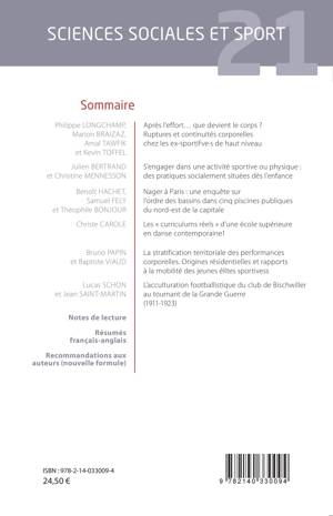 Sommaire: Après l'effort... que devient le corps ? Ruptures et continuités corporelles chez les ex-sportif-ve-s de haut niveau S'engager dans une activité sportive ou physique: des pratiques socialement situées dès l'enfance Nager à Paris: une enquête sur l'ordre des bassins dans cinq piscines publiques du nord-est de la capitale Les curriculums réels d'une école supérieure en danse contemporaine La stratification territoriale des performances corporelles. Origines résidentielles et rapports à la mobilité des jeunes élites sportives L'acculturation footballistique du club de Bischwiller au tournant de la Grande Guerre (1911-1923)